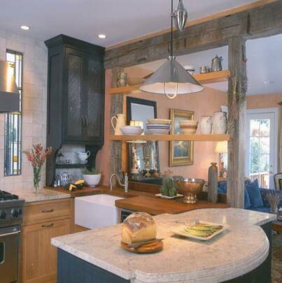 This kitchen is placed in the heart of the cottage alongside the living room and dining area. The beams and columns were introduced to create a room divider while not loosing the light or view of the pretty back yard.