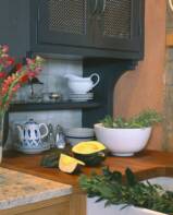 The country style kitchen also has a number of textures. First we have the inset paneled doors and drawers, natural quarter sawn oak and then the stained blue peninsula and hutch. The hutch has steel mesh panels and the counters are silver gray granite and sealed solid planked teak. The appliances are stainless steel and the windows have custom art glass from our local artisan.